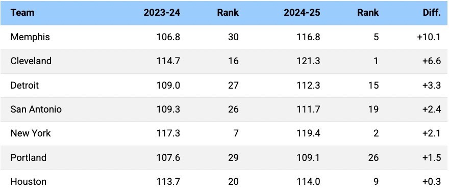 r但随着赛季接近一半,有七支球队的进攻效率已超过2023-24赛季: